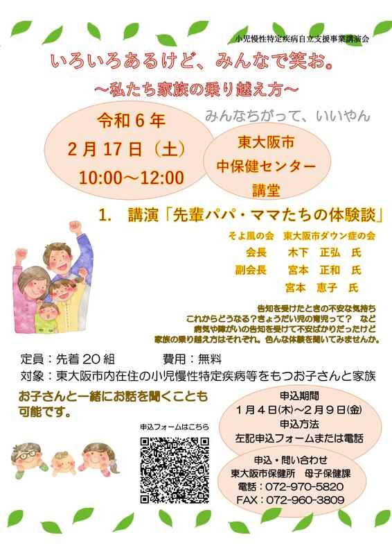 講演では、東大阪市ダウン症の会「そよ風の会」の会長・副会長が体験談「私たち家族の乗り越え方」を語るほか、意見交換も行います。