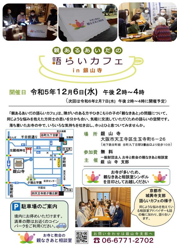 2023年12月6日㈬ 14時~16時 銀山寺さまにて『親あるあいだの語らいカフェ』が開催されます。介護者カフェと同時開催お寺と教会の親なきあと相談室主催『親あるあいだの語らいカフェ』と浄土宗社会福祉ネットワーク事業支援による『介護者カフェ〜えん〜』同時開催。