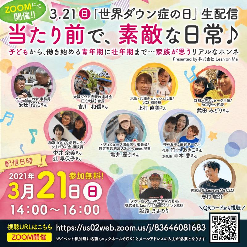一覧へ メディア情報 3/21「世界ダウン症の日」に生配信トークイベント 投稿日時: 2021/03/20 jimy 株式会社Lean on Me(代表 志村駿介、コンテンツ統括 姫路まさのり)が20201年3月21日14:00から生配信のトークイベントを開催します。クローバーの会からも3名が参加するよ!PR TIMESに掲載された詳細は、下記の画像をクリック