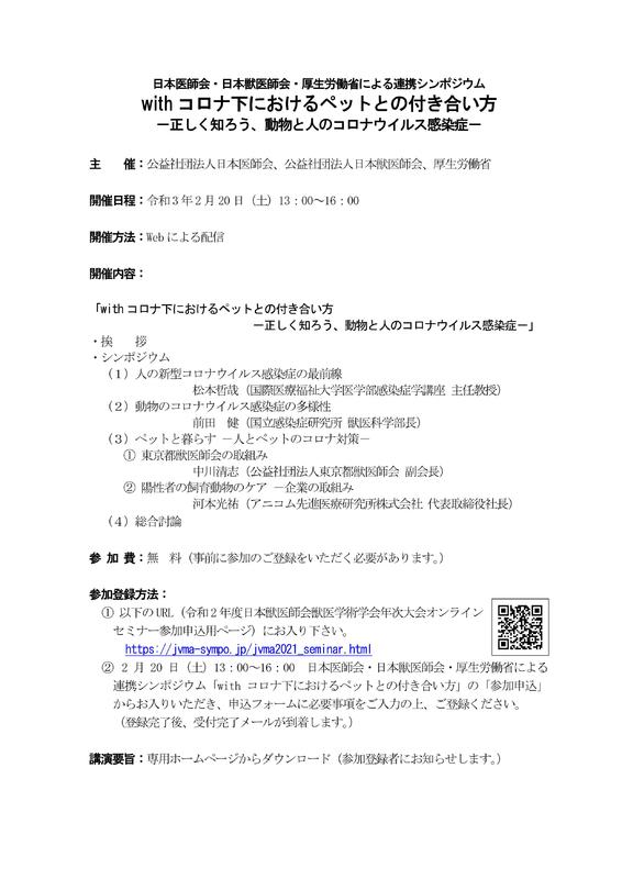 一覧へ セミナー情報 オンライン with コロナ下におけるペットとの付き合い方 -正しく知ろう、動物と人のコロナウイルス感染症- 投稿日時: 2021/02/10 jimy PDFファイルは→こちら with コロナ下におけるペットとの付き合い方2 (1).pdf
