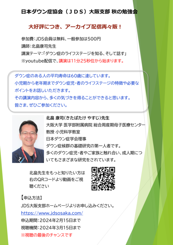 日本ダウン症協会(JDS)大阪支部では、下記の通り秋の勉強会を開催します(申込方法を一部修正しました)。