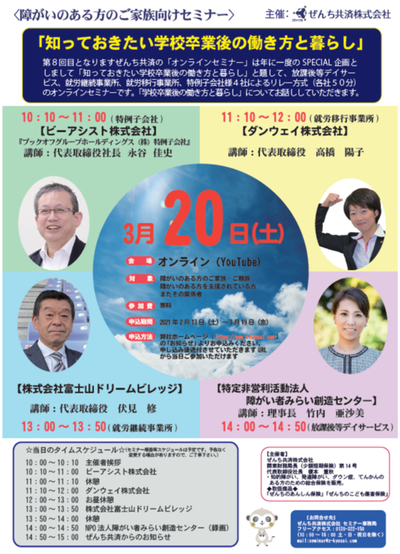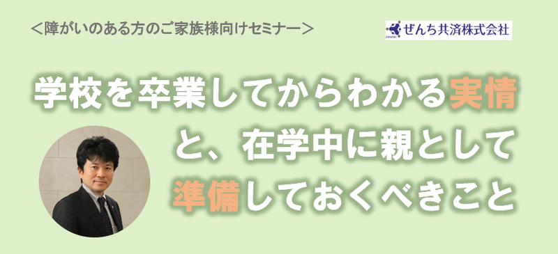 ぜんち共済株式会社では、2021年2月13日(土)に「障がいのある方のご家族や支援されている方向けセミナー」を開催します。講師に、全国特別支援学校知的障害教育校PTA連合会顧問の金成祐行さんを迎え、特別支援学校を卒業してから分かる実情と、在学中に親として準備しておくべきことについてお話いただきます。