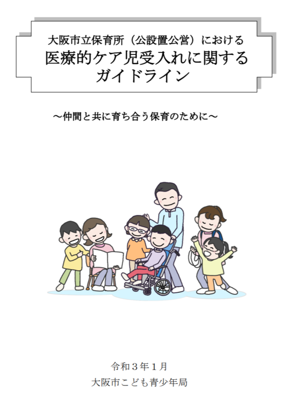 大阪市では「地域社会の中で障がいのあるこどもが、仲間と共に育ち合う」ことを基本的な考え方として障がい児保育の推進に努める中、医療的ケアを必要とするこどもを受入れる際の「大阪市立保育所(公設置公営)における医療的ケア児受入れに関するガイドライン」を策定しました。