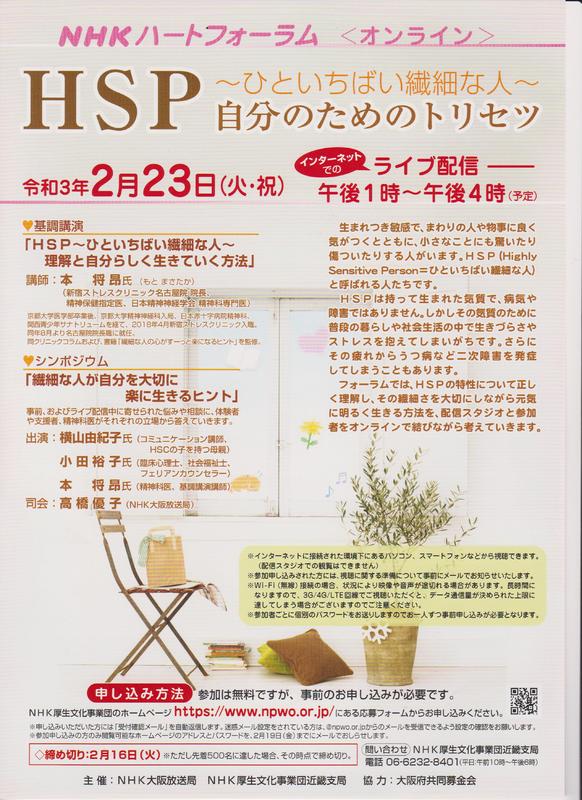 「HSP~ひといちばい繊細な人~ 自分のためのトリセツ」NHKハートフォーラム<オンライン>が開催されます。