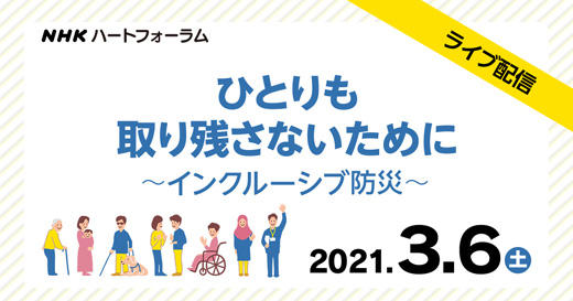 NHKハートフォーラム 「ひとりも取り残さないために〜みんなで助かるインクルーシブ防災〜」ハートフォーラムを3月6日(土)にライブ配信。視聴受け付け開始!