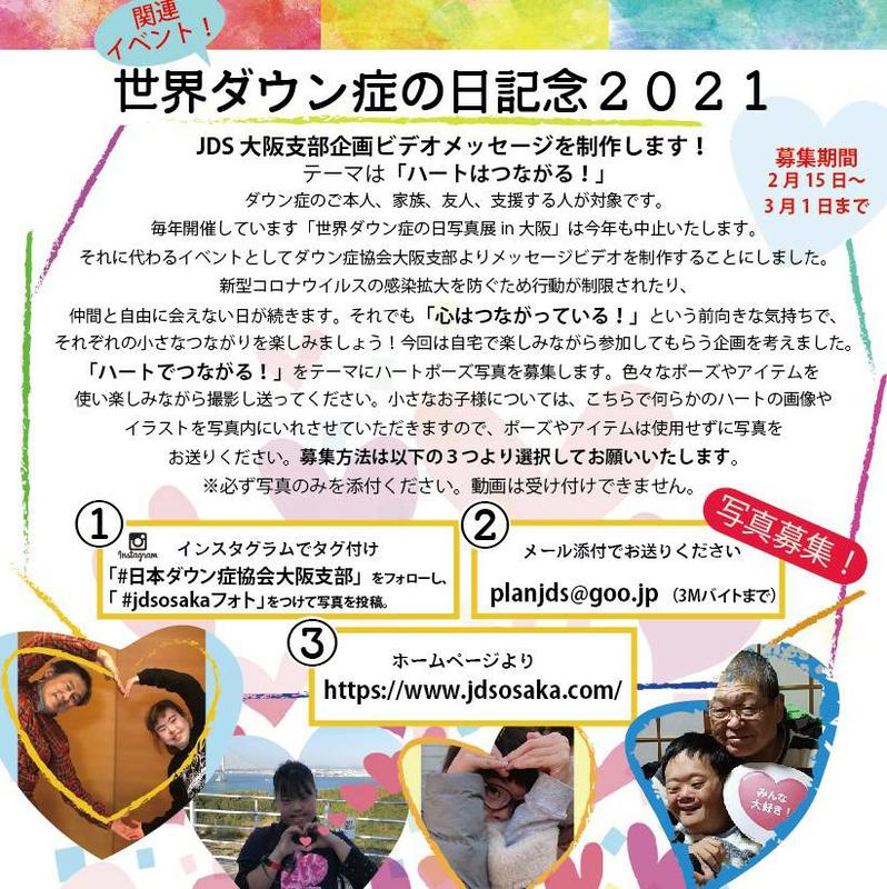 日本ダウン症協会大阪支部の、「世界ダウン症の日写真展in大阪」は今年も新型コロナウイルス感染症下記代防止の観点から中止せざるを得ない状況ですが、皆さんからいただいた写真をつなぐ動画を作成することになりました。