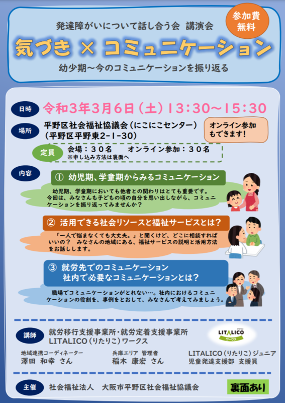 場 所:平野区社会福祉協議会(にこにこセンター)※オンライン参加も可。