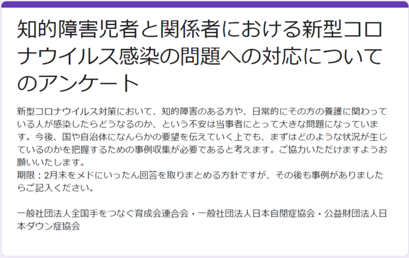 一般社団法人全国手をつなぐ育成会連合会・一般社団法人日本自閉症協会・公益財団法人日本ダウン症協会では、知的障害児者と関係者における新型コロナウイルス感染の問題への対応についてのアンケートをお願いしています。