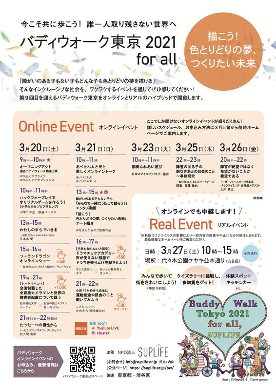 今年のバディウオーク東京は、主催をアクセプションズからSUPLIFEが引き継ぎ、オンライン&リアルで開催されます。イベント名は 『Buddy Walk Tokyo 2021 for all』