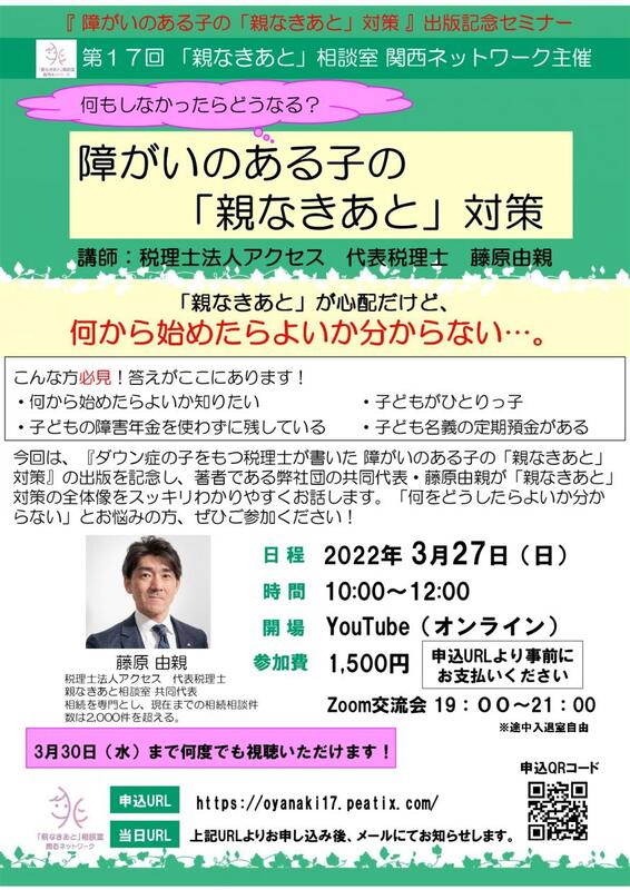 今回は『ダウン症の子をもつ税理が書いた障がいのある子の「親なきあと」対策』の出版を記念し、著者である親なきあと相談室関西ネットワークの代表理事である藤原由親が「親なきあと対策の全体像をスッキリわかりやすくお話します!