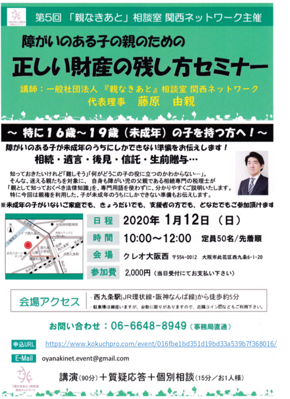 2020年1月12日(日)に第5回「親なきあと」相談室関西ネットワーク主催のセミナーが開催されます。