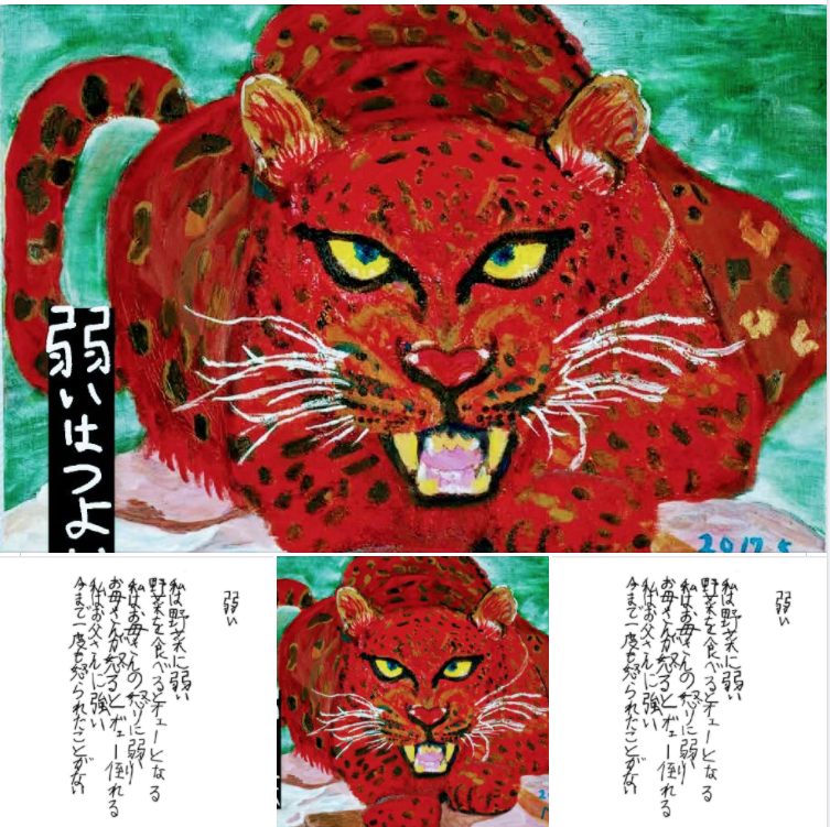 ゆかちゃんは、みんな笑顔に元気にするアメちゃんを空から配っているような、ユーモアと愛嬌あふれる元気いっぱいの天使。みゆうちゃんは、か細い声と風貌とはまったく異なる、熱いマグマ、情熱、意思、エネルギーとパワーを感じさせる乙女。本の中面をチラ見せ致します。ゆかちゃんによる詩「弱い」と、みゆうちゃんによる扉の絵(赤い豹!)です。詩と絵を60-70編掲載。ちなみに、ゆかちゃんは、NHKハート展で6回入選。5000人を超える詩の中から6回も選ばれている才能あふれる詩人。今回初の著作となります。そして、原田大二郎さん、セイン・カミュさん、キンタローさん、ロコ・サトシさん、藤岡みなみさんといった有名人が、詩に合わせて描いてくださった絵も掲載されています(風鳴舎FaceBookページより)。