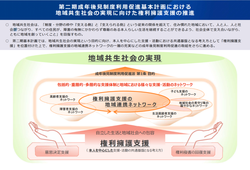 成年後見制度の利用の促進に関する法律では、成年後見制度の利用の促進に関する施策を総合的かつ計画的に推進するとされています。2022年3月25日に第二期成年後見制度利用促進基本計画が閣議決定されました。令和4年度から令和8年度まで、計画に基づいて施策を実施します。