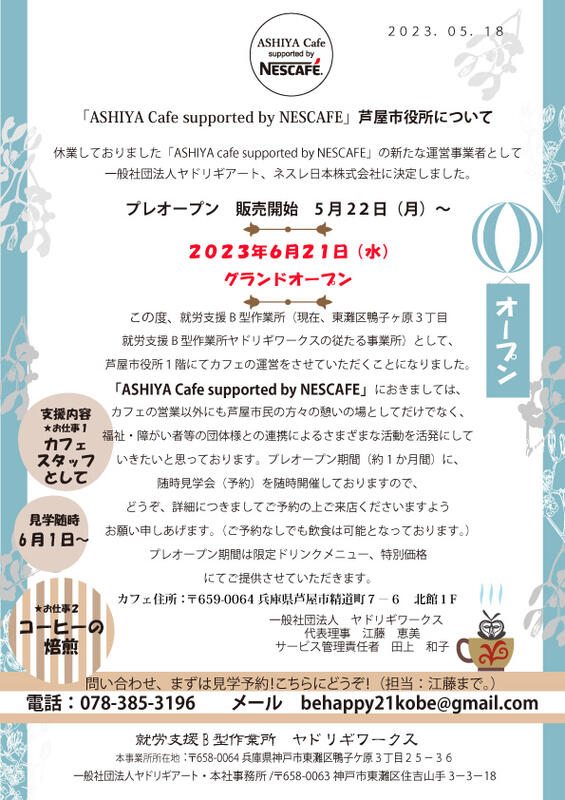 神戸市東灘区で就労支援B型作業所を運営するヤドリギワークスが、ネスレ日本㈱と協業して芦屋市役所1階にカフェをオープンします。