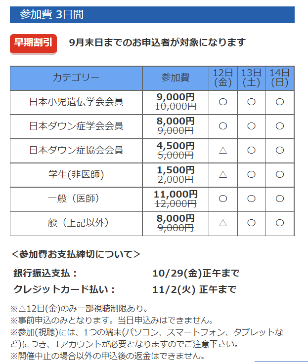 参加費 9月末までの申し込みで下記の通り早期割引となります。