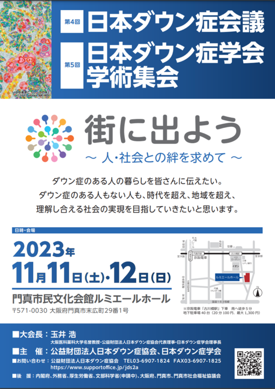 第4回日本ダウン症会議・第5回日本ダウン症学会学術集会が2023年11月11日・12日に大阪府の門真ルミエールホールで開催されます。小児期から高齢期までライフステージに合わせたシンポジウムが開催されます。この会議のホームページが公開されました。